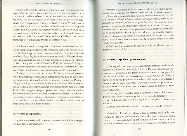 E como era encarado este problema no tempo de Salazar? Aparentemente, do mesmo modo, ou seja, resistir até morrer em declaração pública para inglês ver. No entanto, segundo o relato de um insuspeito Kaulza de Arraiga, no livro de Jaime Nogueira Pinto, Salazar visto pelos seus próximos, de 1993 e agora reeditado ( Bertrand Editora) cuja leitura aconselho vivamente, o assunto não era assim tão linear: