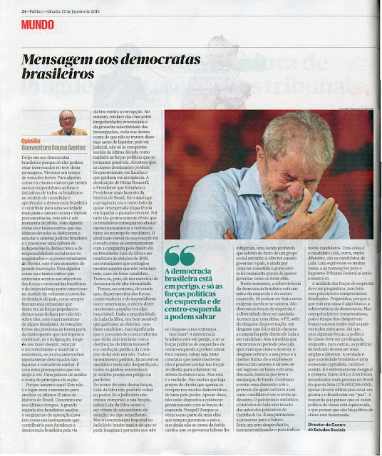 O brasileiro Lula da Silva, esperança eleitoral do PT para chegar outra vez ao poder no sistema democrático brasileiro, em nome da Esquerda unida, foi condenado por crimes de corrupção. Foi condenado uma e outra vez, em pena de prisão que o afasta de concorrer à presidência que abre as portas à democracia tal como a Esquerda popular a entende.