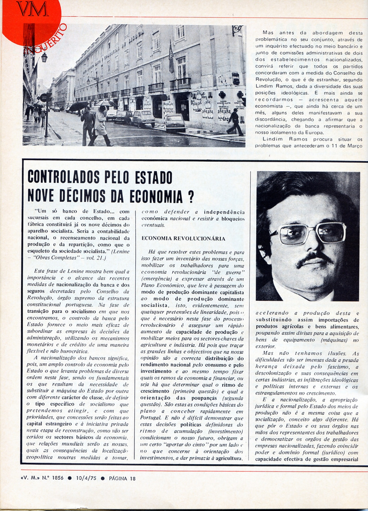 Em 1975 o comunismo conseguiu um objectivo: capar o sistema capitalista e pôr eunucos a mandar no mesmo. Na sequência das nacionalizações a nossa economia ficou quase na totalidade nas mãos do Estado. Que os comunistas queriam controlar também, com a ajuda preciosa da maioria esmagadora dos jornalistas, alguns deles, hoje em dia, reciclados no "socialismo democrático" ou mesmo na dita "direita" que nunca o foi. Esta imagem da Vida Mundial de 1975, a seguir às nacionalizações dá uma imagem do que se passou.