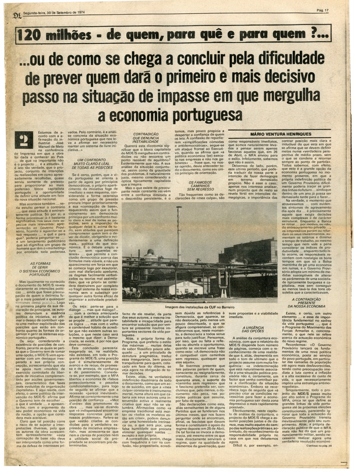 Ainda assim, para entender a nova mentalidade reinante em Portugal, o que o mesmo refere ao diário é interessante, porque totalmente novo e nunca experimentado nos 40 anos precedentes...e o diagnóstico do professor de Economia era optimista...se fosse cumprido o programa do MFA. E foi. Dali a dois anos estávamos na bancarrota e tivemos que pedir ao FMI e a outras entidades, para nos ajudarem.