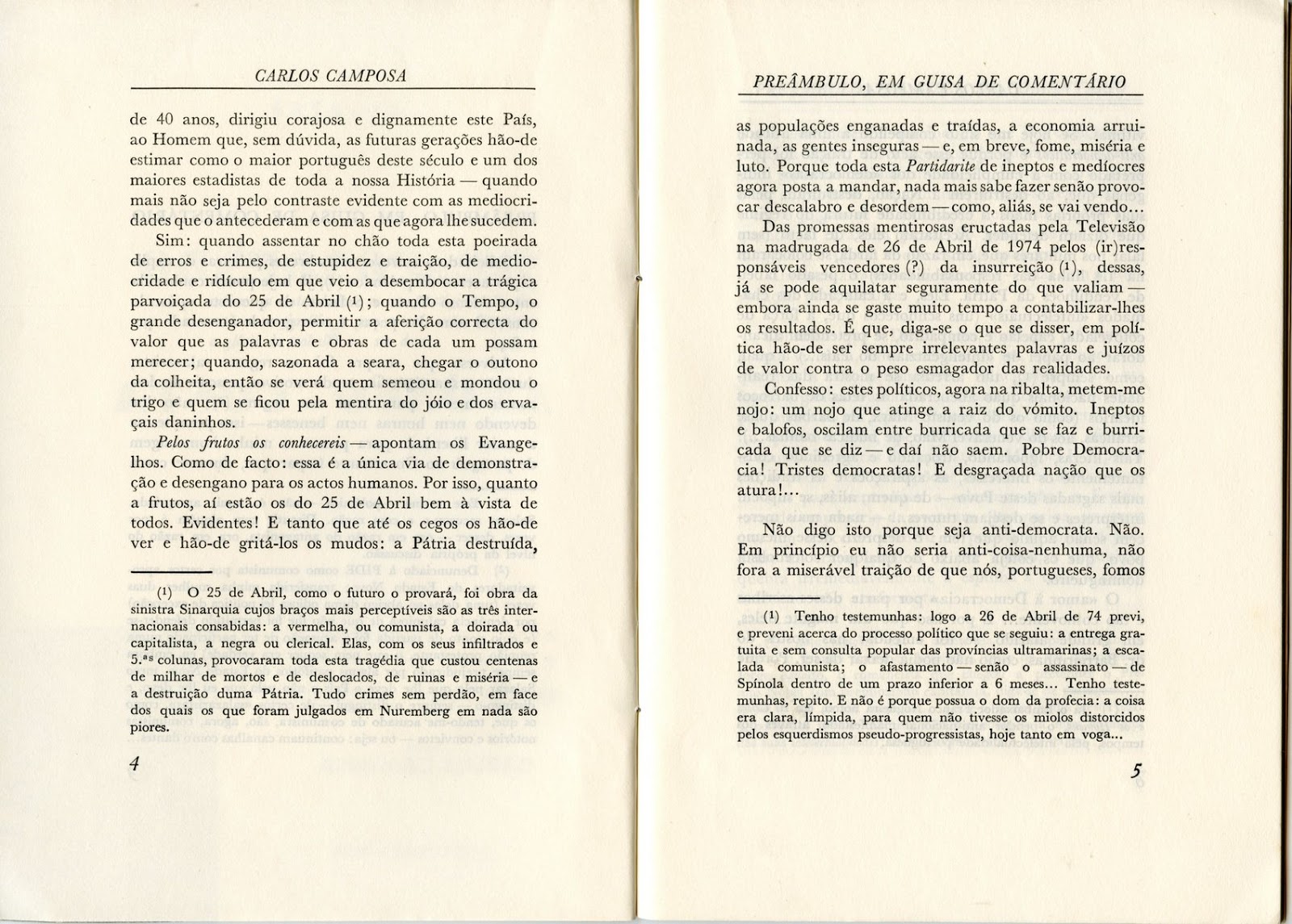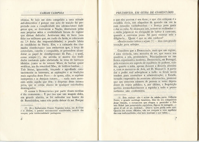 Um opúsculo publicado em 1976, da autoria de um Carlos Camposa, mostra várias coisas: como a História contemporânea pode reservar surpresas a quem a despreza e ao mesmo tempo a lição de uma superioridade moral. Ao contrário dos comunistas que sempre a reivindicaram, as figuras do antigo regime, como Salazar merecem esse estatuto que lhes é denegado pelos Rosas&Pereira da actualidade.