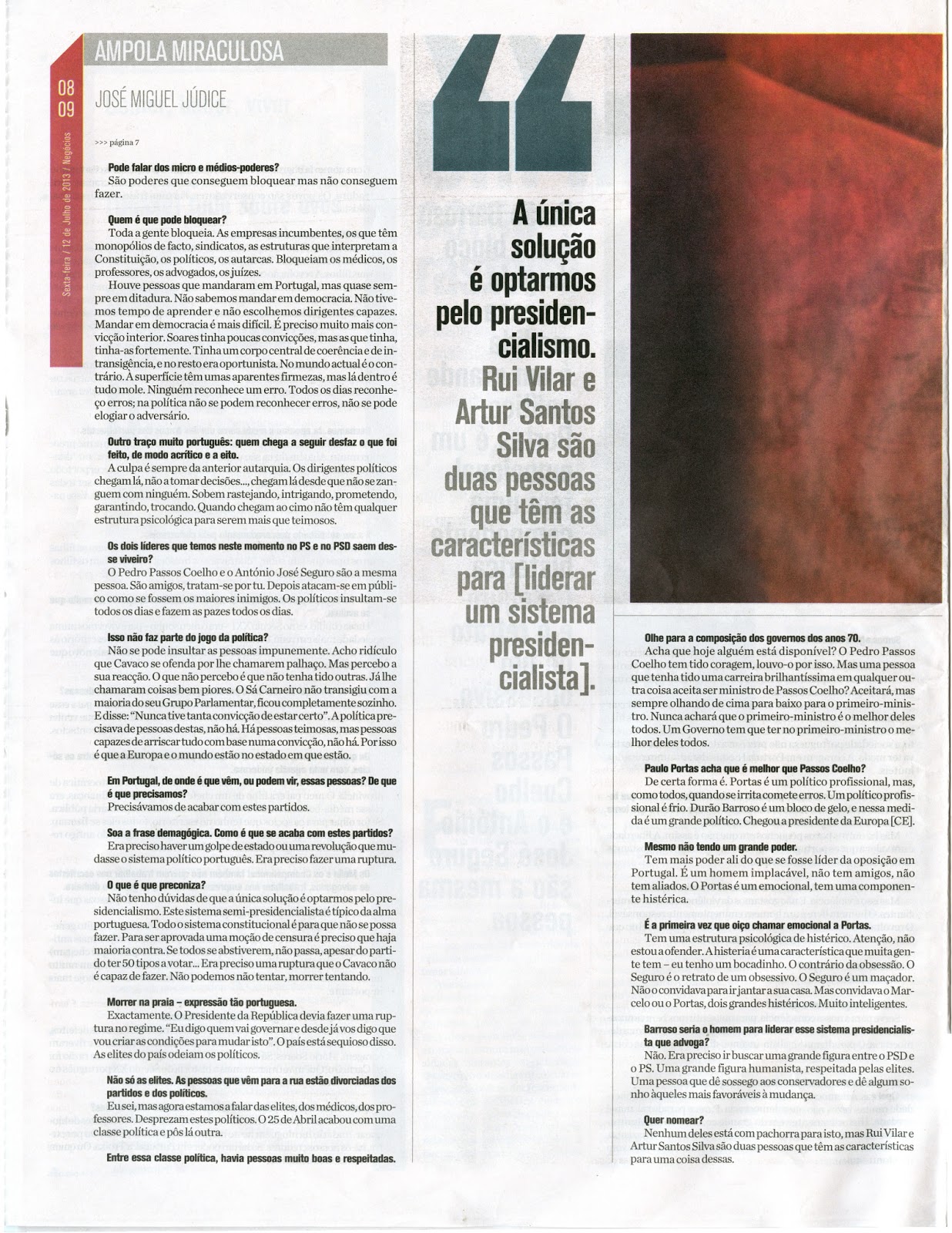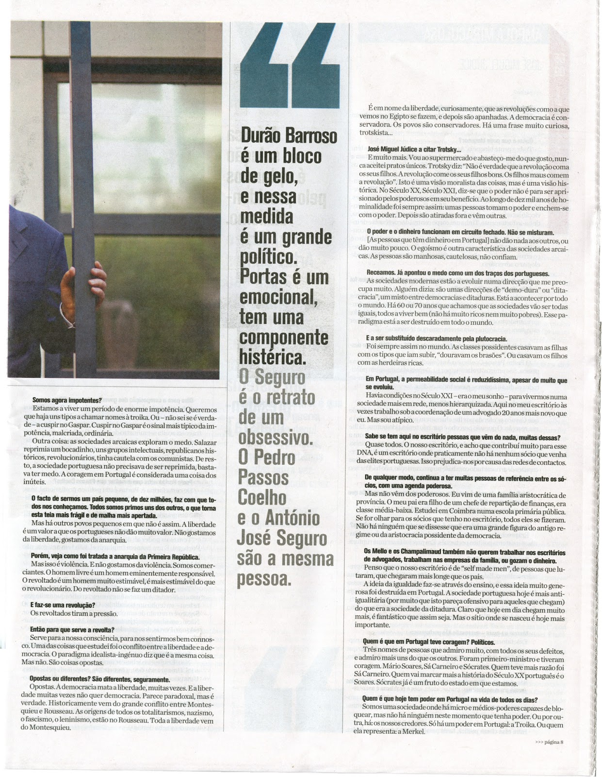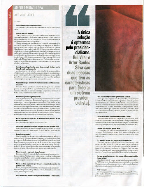 Fala de outras coisas entre as quais a de ter sofrido uma desilusão com a morte de Sá Carneiro ( democratizou-se rapidamente nessa altura, vindo do MIRN) e a "segunda grande desilusão foi com o cavaquismo. Cavaco Silva teve tudo, tudo." Deve ter sido por causa dessa desilusão que se virou para o PS de Sócrates que aliás considera como um dos três nomes de pessoas que admira. Não admira nada...sabendo como o escritório de Júdice prosperou nesta última dúzia de anos. Mas perguntas sobre isso...moita carrasco. Assim ficamos com a espuma dos ditos avulsos entre os quais avulta a menção a um putativo golpe, do género do desejado por um Otelo ou um Vasco Lourenço e duvido que seja diferente dos que estes pretendem.