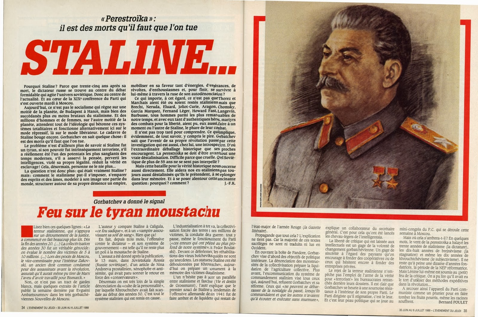 Em 30 de Junho de 1988, Jean-François Kahn, então director do semanário L´´Evenement du jeudi, um lançamento também da sua responsabilidade, alguns anos antes ( nessa altura ia no n´º 191), escreveu um pequeno ensaio de vinte e quatro páginas sobre Estaline, numa altura em que Gorbatchov encaminhava a sua perestroika para o derrube do muro e a queda dos regimes comunistas de Leste.