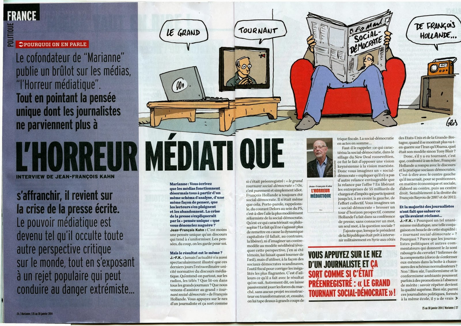Esta semana a revista de que já não faz parte como director, entrevistou-o a propósito de um livro sobre os "media", "L´horreur médiatique" onde mais uma vez denuncia o pensamento único do discuros uniforme. A entrevista aproveitou o tema do presidente François Hollande ter aparentemente alterado o rumo político inicial, para o questionar sobre esse fenómeno.