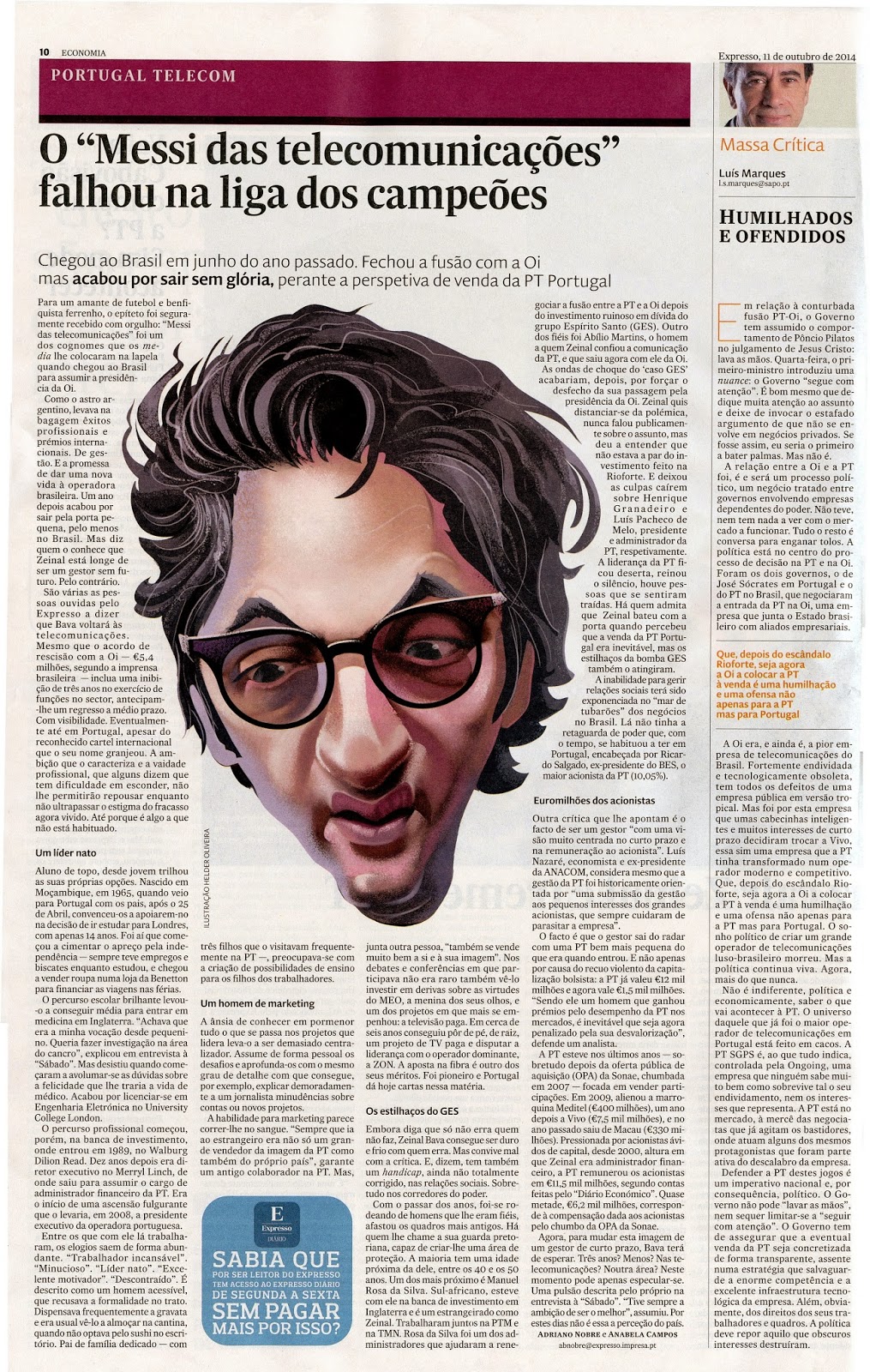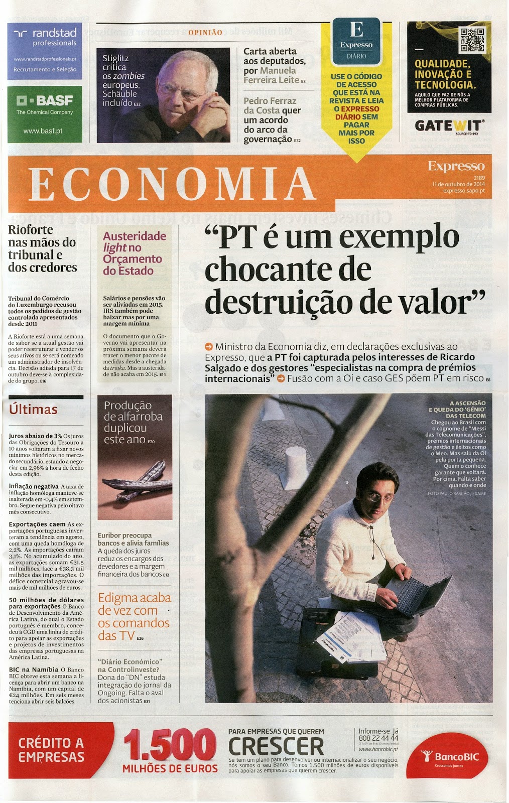 O que diz o ministro Pires de Lima, gestor profissional com provas dadas? Que a causa do desmoronamento da PT reside em três personagens-chave: Sócrates, Salgado e Bava. Mas explica porquê, o que o Expresso nunca procurou fazer de modo decente e profissional: " Qualquer bom analista financeiro consegue perceber como se destruiu este valor na PT em oito anos e consegue identificar as decisões de gestão e de carácter político que tiveram interferência nesta destruição de valor, bem como estas últimas decisões inexplicáveis, em que de repente se percebeu que a comissão executiva da PT estava prisioneira, capturada, dos interesses de Ricardo Salgado". Voilà!