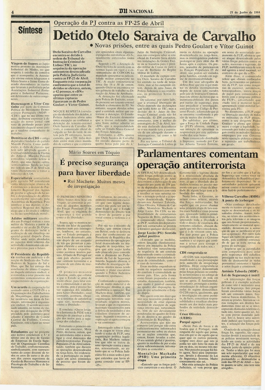 No dia seguinte o Diário de Notícias dava assim a notícia dos factos ocorridos, com opiniões de responsáveis políticos de então. Mário Soares estava no Japão, mas sabe-se agora que tomou conhecimento prévio da operação e eventualmente interferiu na mesma, dando o seu "agréement", por um equívoco relativo a um nome: pareceu-lhe que um dos suspeitos seria membro destacado do PCP e tal equivaleria a matar politicamente uma força incómoda para o governo de então.